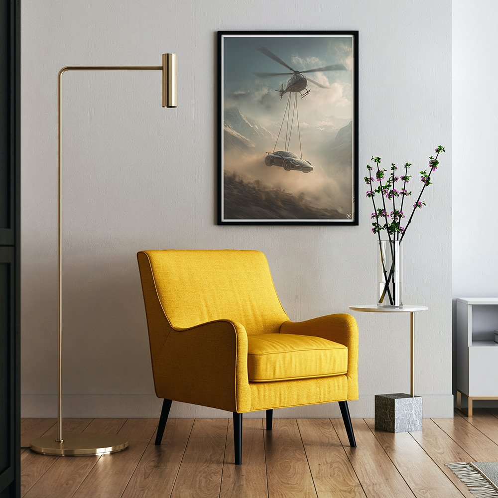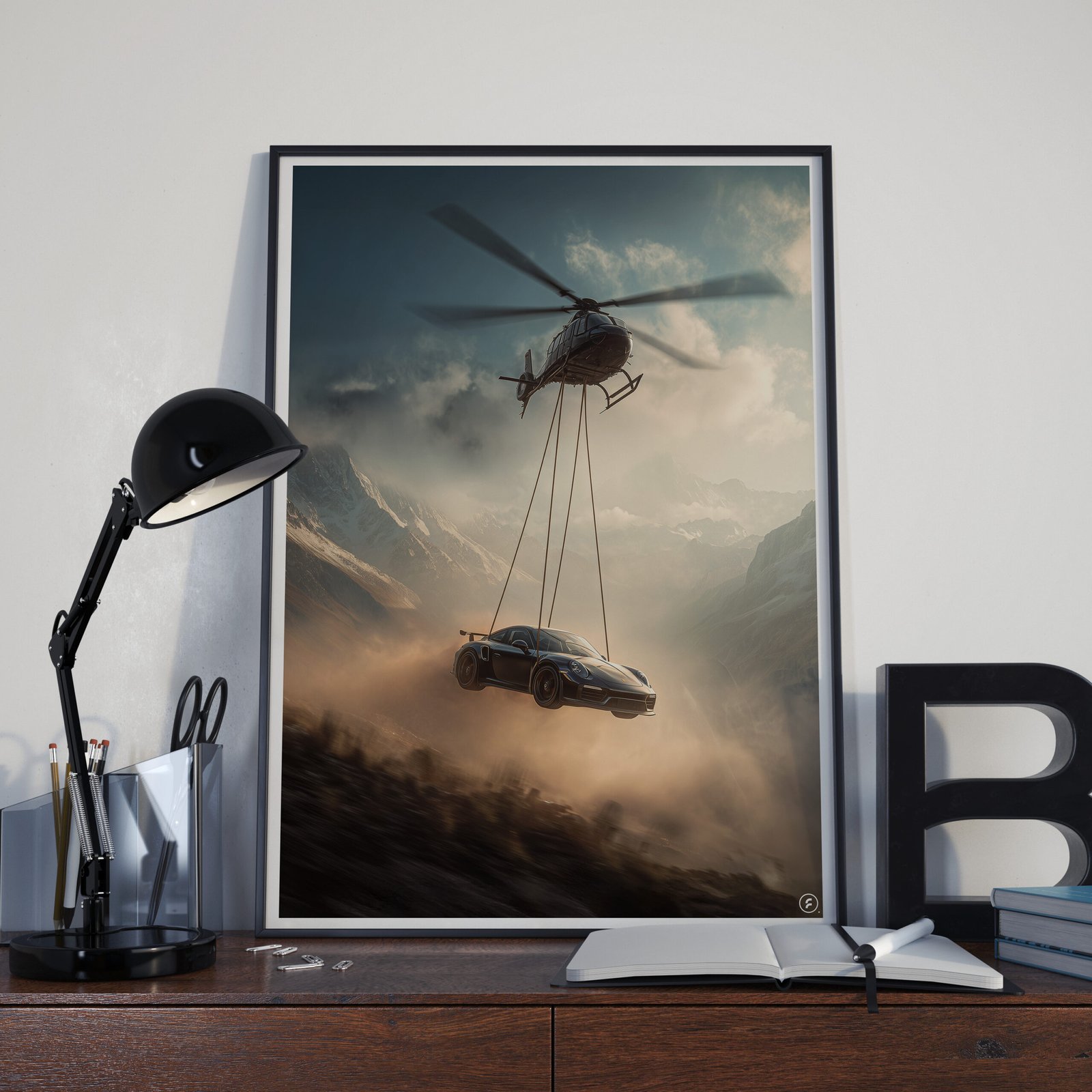Elevate your walls with the Porsche 911 hanging on Helicopter, combining automotive excellence and aerial adventure in a cinematic artwork. Ideal for fans of speed, flight, and high-performance visuals.